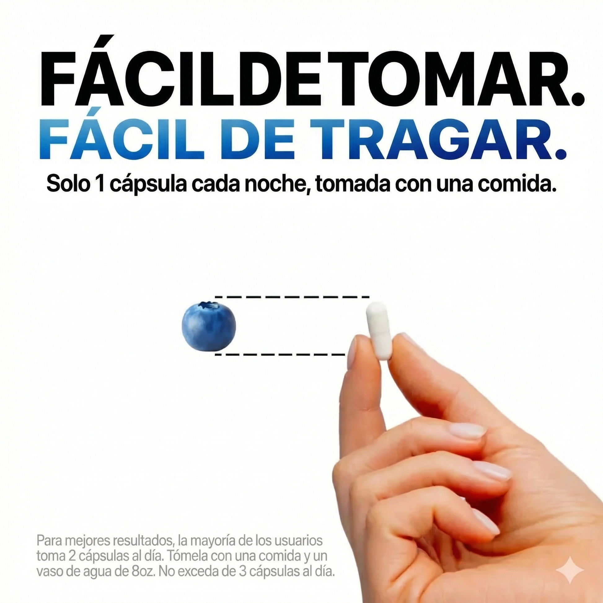 Tome solo 1 cápsula cada noche junto con una comida y un vaso lleno de agua.